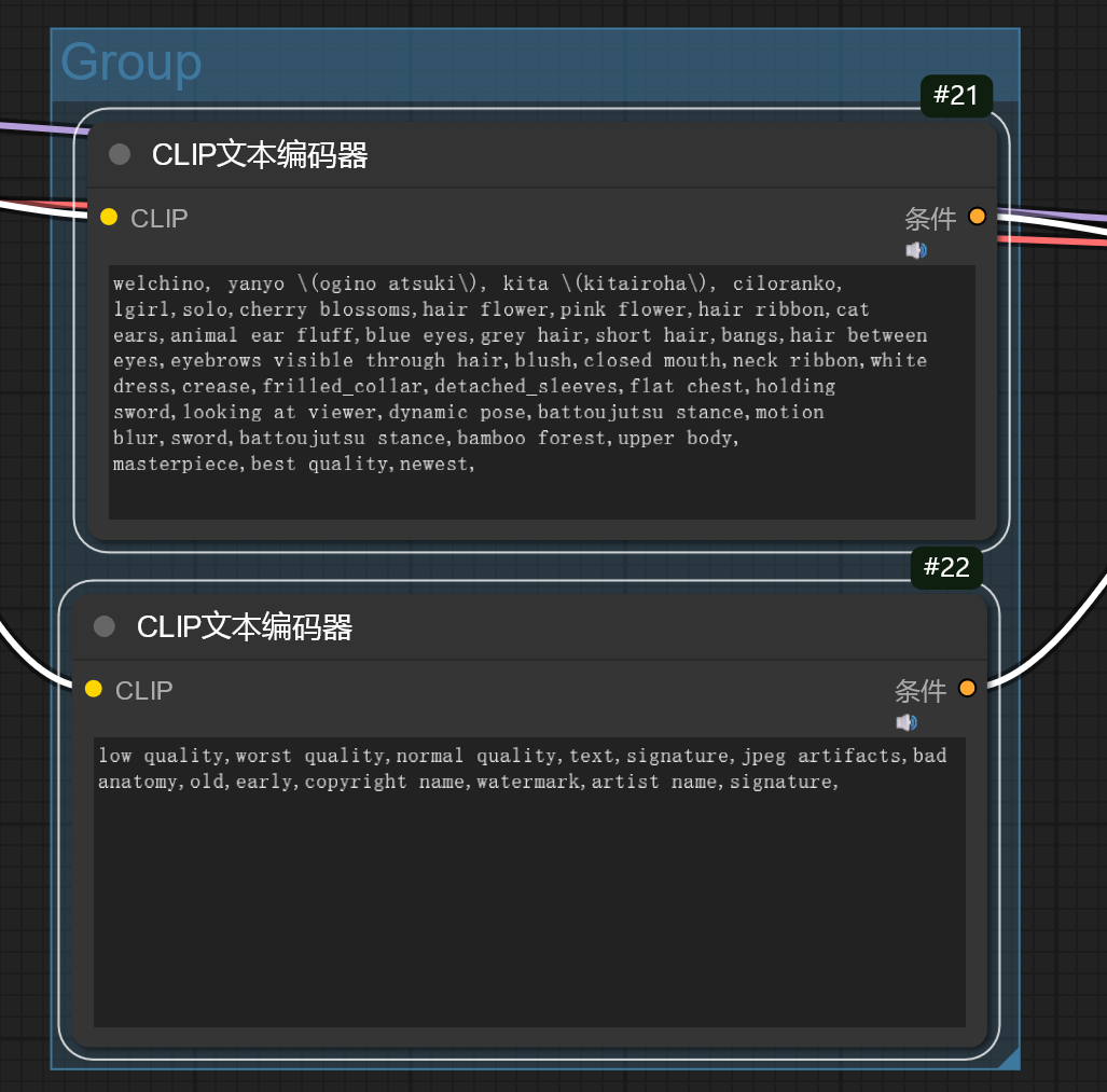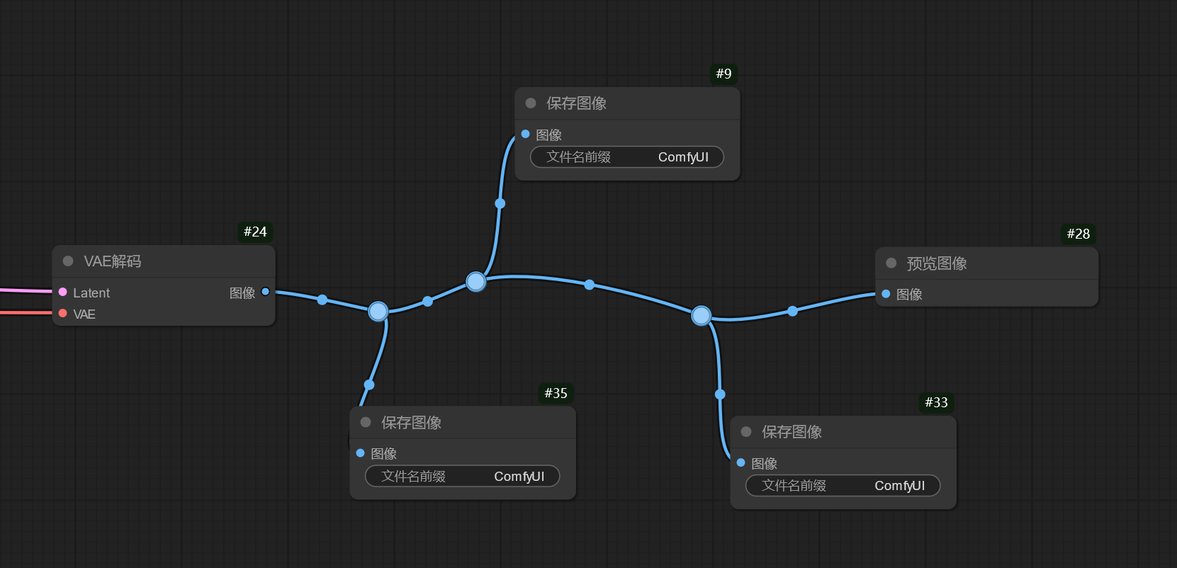节点之间连线可以通过按住节点的接口拉出一条线,将线连接到另一个节点上。如果一个节点的输出想要拉出两条线,除了从接口分别拉出两条线这个方法,还可以在有一条线的基础上,按住 Shift 键并点击那条线,此时将快速从该线的端点快速拉出一条线,而不是必须从输出接口拉线。