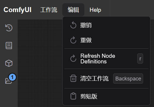 | 作用 | 显示关于工作流的操作。 | 显示编辑工作流的功能。 | 获取 ComfyUI 帮助。 | 显示 ComfyUI 运行日志。 | 隐藏 / 显示 ComfyUI 工具栏。 |