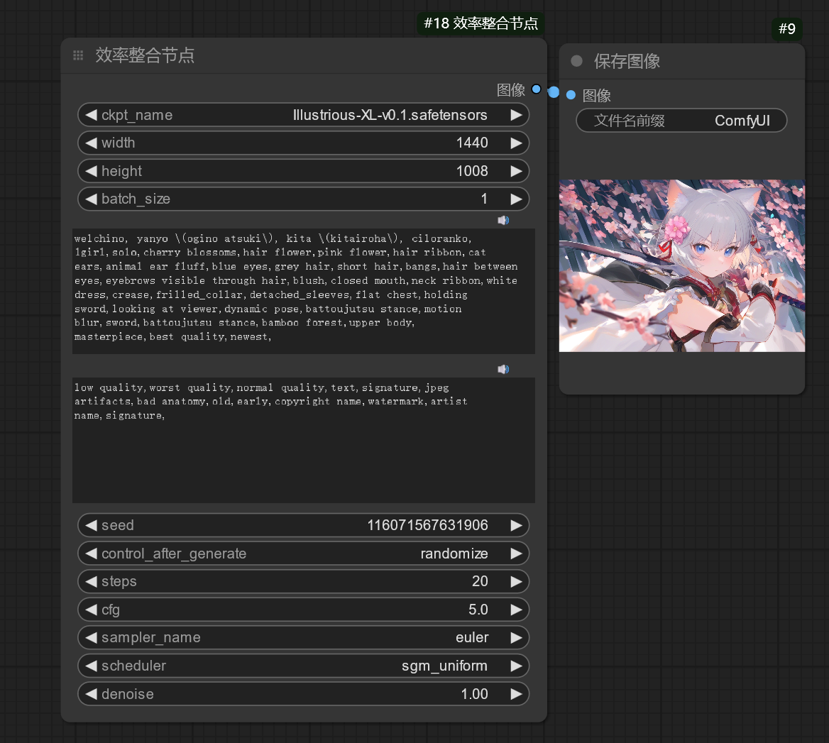 下面是一个简单的生图工作流,可以看到该工作流有许多节点组成。