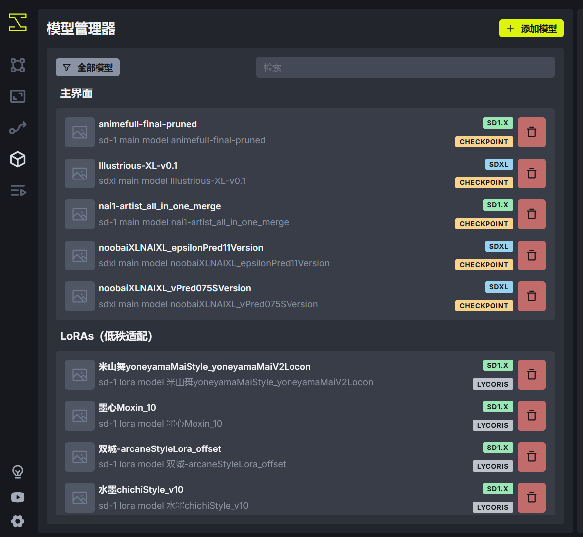 在模型管理器的左侧列出已经添加到 InvokeAI 中的模型,并且使用不同的版本标签和类型标签进行分类。