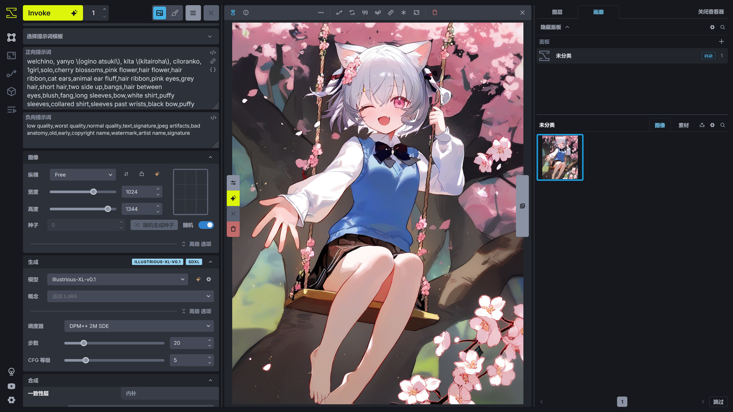 点开生成选项的高级选项可以看到调度器、步数、CFG 等级设置。InvokeAI 和 Stable Diffusion WebUI、ComfyUI 有些区别,在 InvokeAI 中采样器选项和调度器选项是合为一起的。