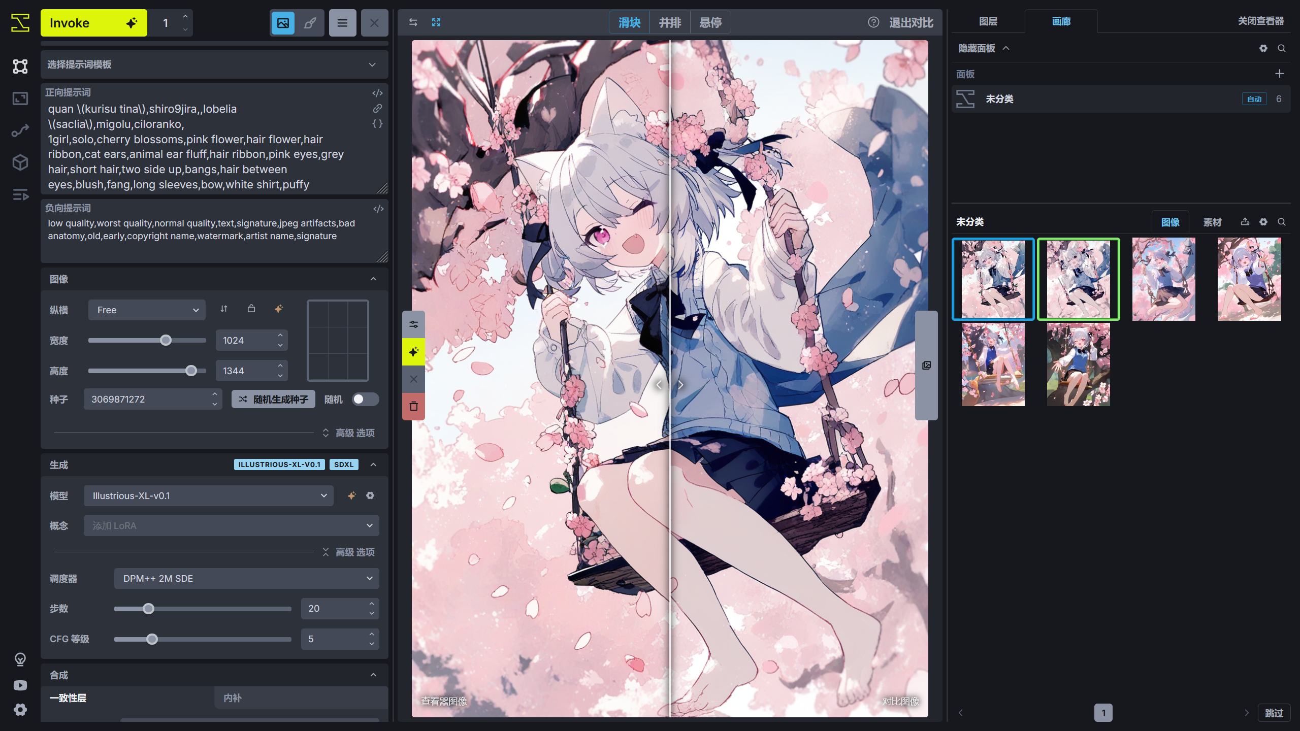 画廊可以查看 InvokeAI 保存的图片,如果需要对比画廊中的两张图片的差别时,可以在画廊中选中一张图片,并按住 Alt 键,选择另一张图片,此时将打开图片对比功能。