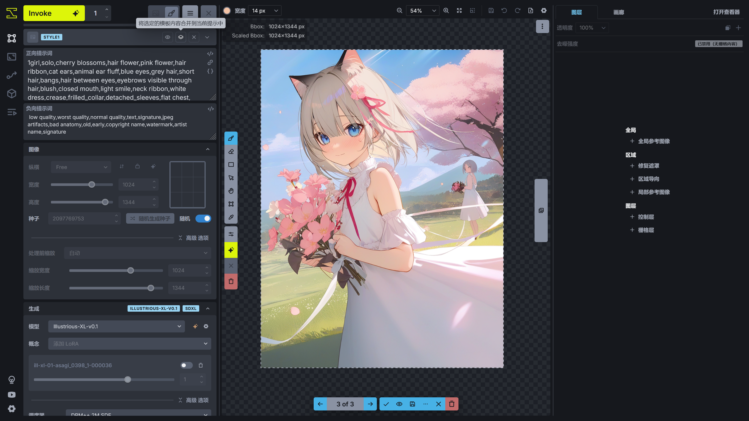 左上角为 InvokeAI 的生成选项,点击 Invoke 按钮可以进行图片生成,如果该按钮为灰色,可以将鼠标移到按钮上,InvokeAI 将展示哪些参数不满足生成的要求并根据提示进行修改。如果需要生成多张图片,可以多次点击 Invoke 按钮。