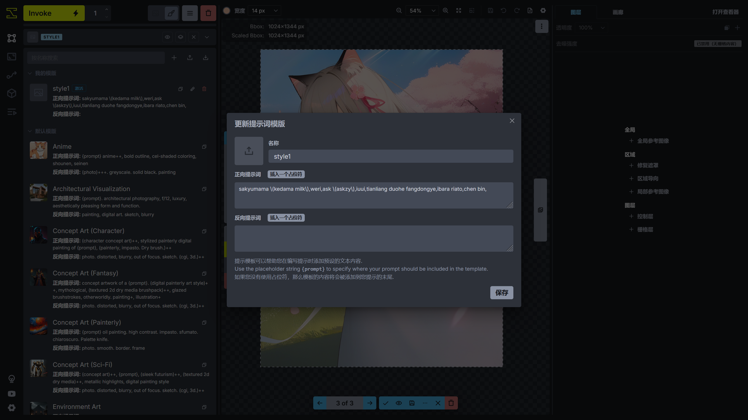 当有提示词中有常用的提示词,比如画风提示词,此时可以创建一个提示词模板方便调用,在正向提示词框的上方可以看到选择提示词模板选项,打开后可以看到 InvokeAI 内置的部分提示词模板,选择后即可使用,或者点击 + 号添加自己的提示词模板,输入模板名称和提示词后点击保存即可。