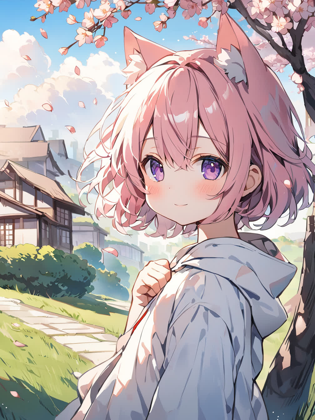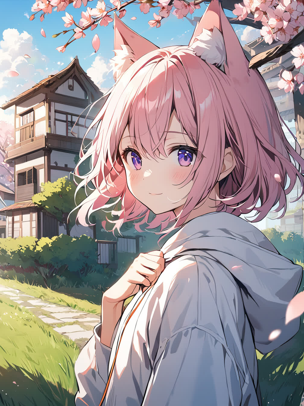 quansarcake,hxxg,chiaroscuro,atdan, 1girl,animal ears,animal ear fluff,cat ears,pink hair,short hair,bangs,blush,closed mouth,light smile,purple eyes,hair between eyes,white hoodie,flat chest, looking at viewer,under the tree,hand on own chest,fist, landscape,grass,flower,blue sky,cirrocumulus,moody lighting,sunlight,day,building,house,path,wind,cherry blossoms tree,falling petals, close-up,upper body,from side,