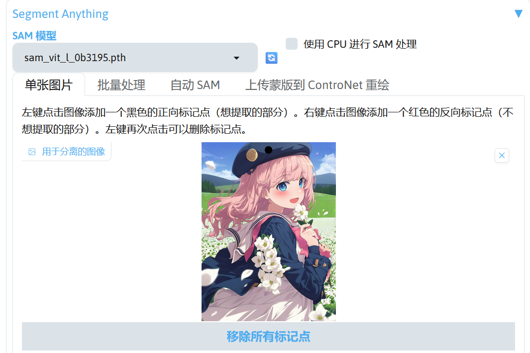现在尝试将 SAM 模型换成 sam_vit_l_0b3195.pth 再点击预览分离结果处理图片。