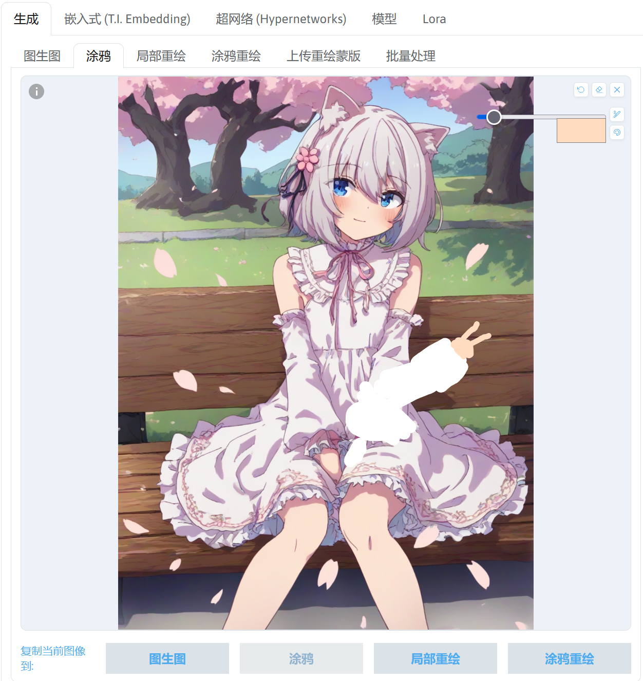 | 局部重绘 | 该模式中提供一个画笔用于绘制图片蒙版,在进行图生图时就可以选择对蒙版的部分进行图生图或者对蒙版外的部分进行图生图。 |