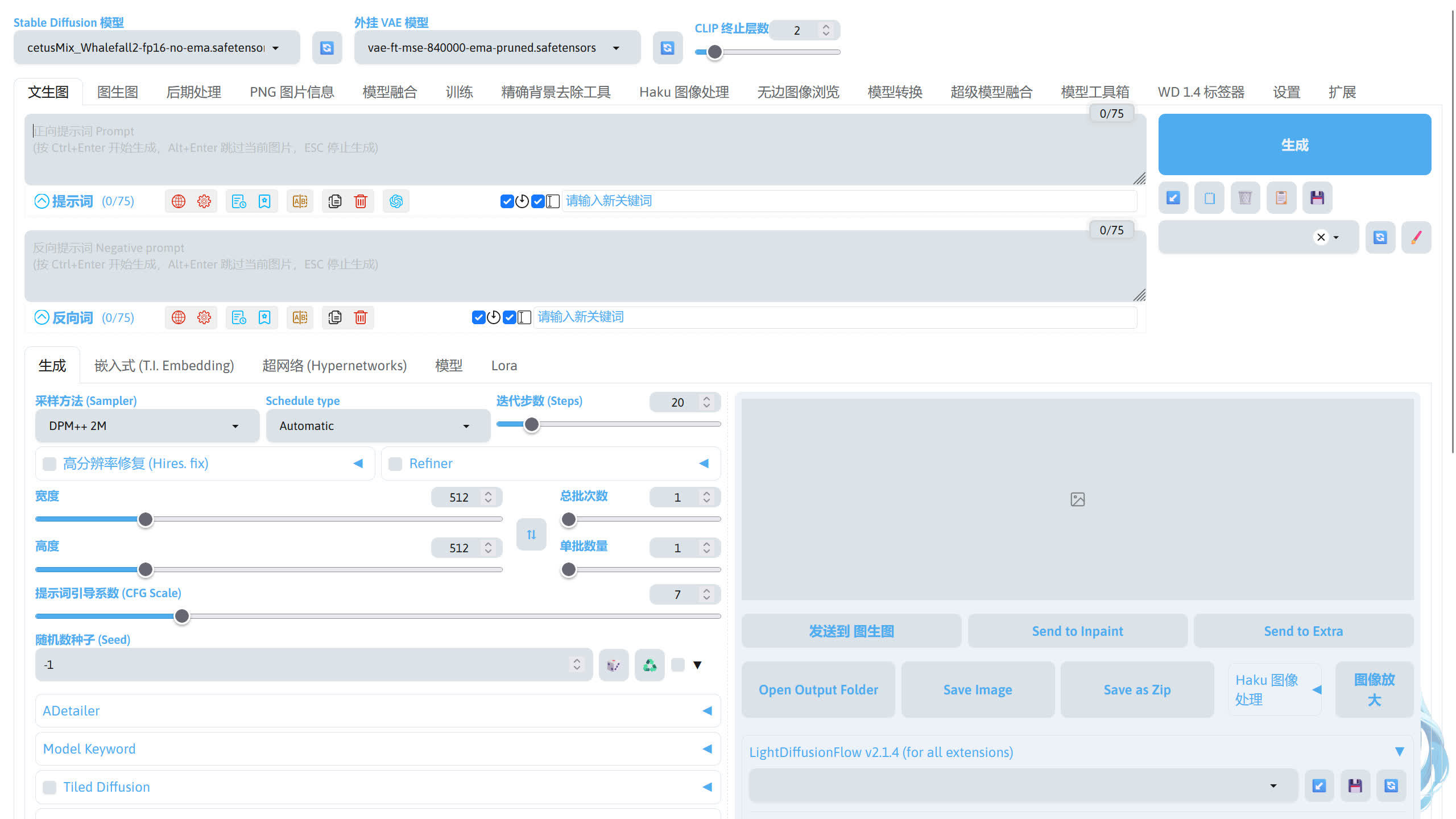 现在我使用的 cetusMix_Whalefall2 模型为 SD 1.5 的模型,适合的分辨率范围为 512 ~ 1024,所以我把宽度和高度分别设置为 768 和 1024。