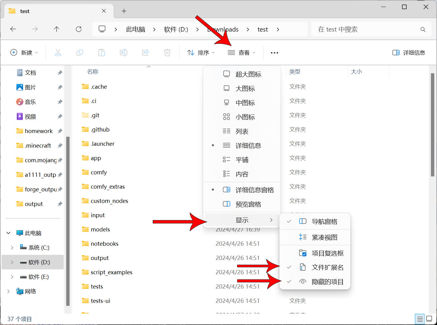 在文件管理器中点击查看->显示,勾选文件扩展名隐藏的项目