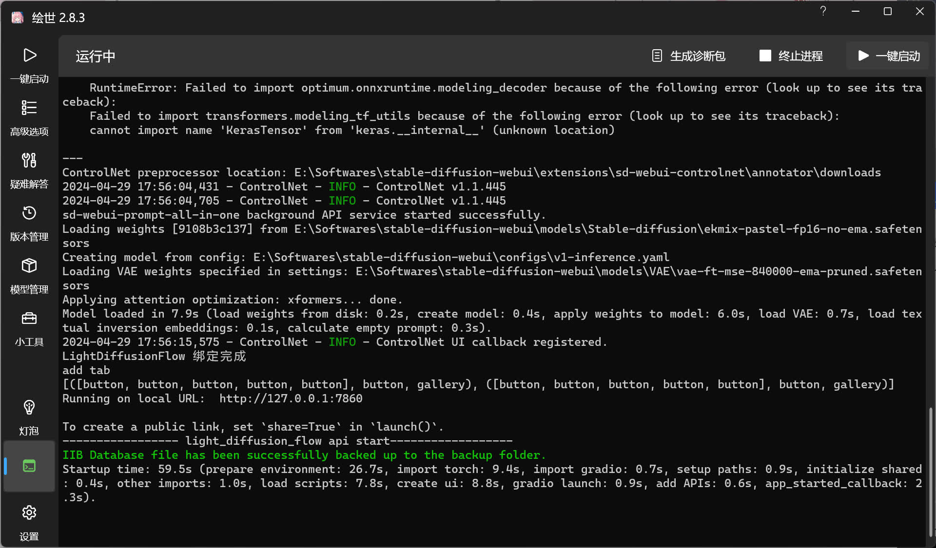 在打开绘世启动器后,左上角显示的 绘世 2.8.3 为绘世启动器的版本。在使用整合包时,或者使用绘世启动器部署的环境时,只有绘世启动器是自动更新的