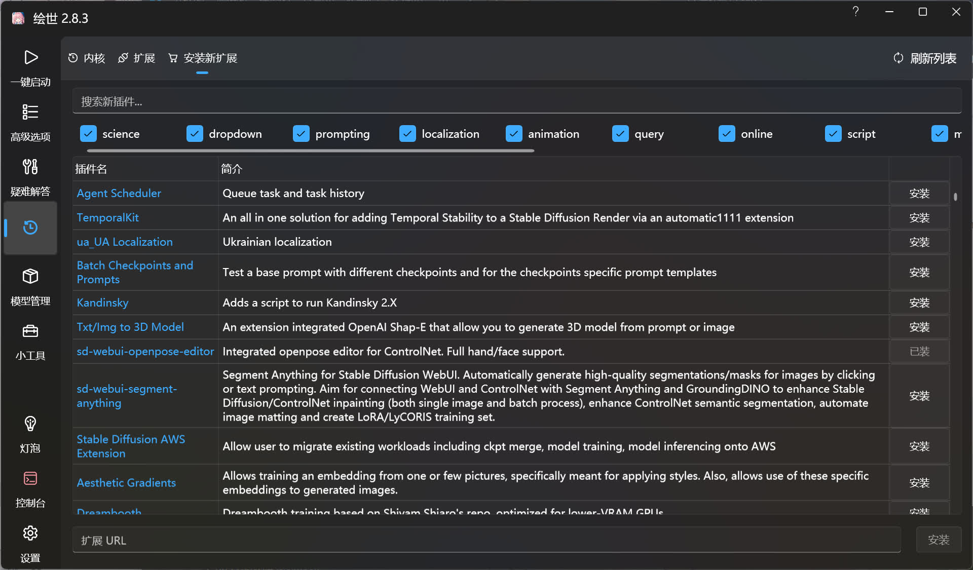 安装新扩展☍ 这里就是安装扩展的地方。 点击右上角的刷新列表可以刷新可安装的扩展列表。 上方的搜索框可用于搜索某个扩展。 !!! 插件安装过多会导致不可预测的问题发生,建议只安装自己需要的!!! 从列表安装扩展☍ 找到想要安装的扩展之后,点击该扩展右侧的安装按钮即可开始安装。 从链接安装扩展☍ 界面最底下有个扩展 URL 输入框,将扩展的安装地址输入进去后,点击右侧的安装按钮即可开始安装。